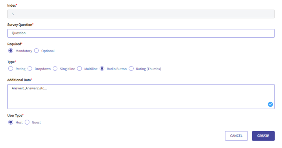 Here you have the option to specify the Question, if the Survey Question is ‘Mandatory’ or ‘Optional’, what type the Survey question will be (Rating, Dropdown, Singleline, Multiline, Radio Button, or Rating(Thumbs)), and whether the Survey question is meant for the Host user or Guest user of the CareAR Assist Session.