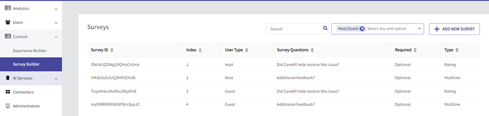 To manage your CareAR Assist Survey question, log into the CareAR Portal with your admin credentials. Once logged in, navigate to Content> Survey Builder. Once there, you will see the list of CareAR Assist Survey Questions already configured for your Tenant, as well as the option to ‘Add New Survey.’