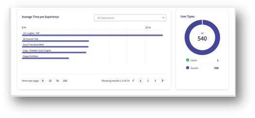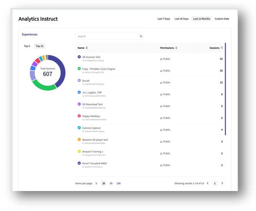 The Instruct Analytics Dashboard provides in-depth view of Instruct usage for all your experiences. You can learn which experiences are most popular, how often specific experiences have been used, how much time users are spending on the experience, and the disposition of the users between logged-in users and anonymous guests.