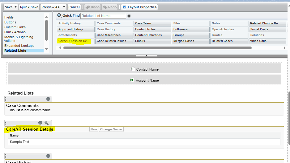 Step 3: Select Related Lists and drag and drop CareAR Session Details into Related Lists below: