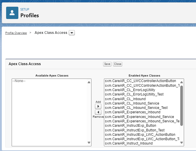 Step 2. Within the newly created profile, navigate to Apex Class Access, select Edit and ensure that all sxm.CareAR* Apex classes are enabled for your profile. See below:
